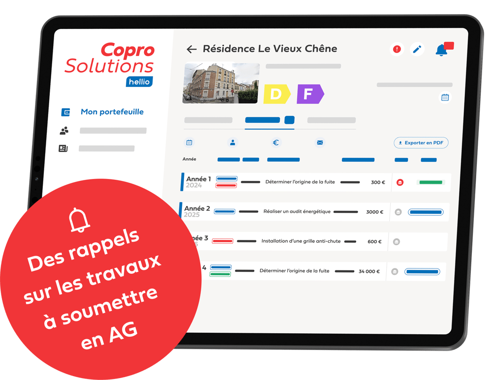 Obtenez une lecture simplifiée de vos échéanciers travaux et des rappels sur les travaux à soumettre en assemblée générale. Voir la vidéo dédiée